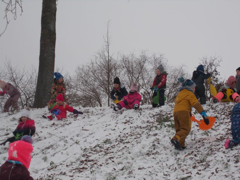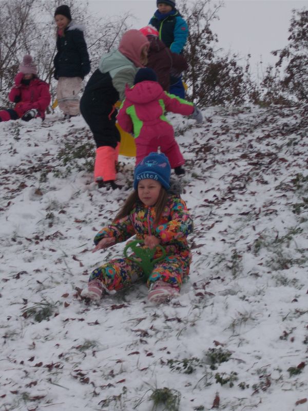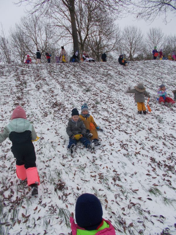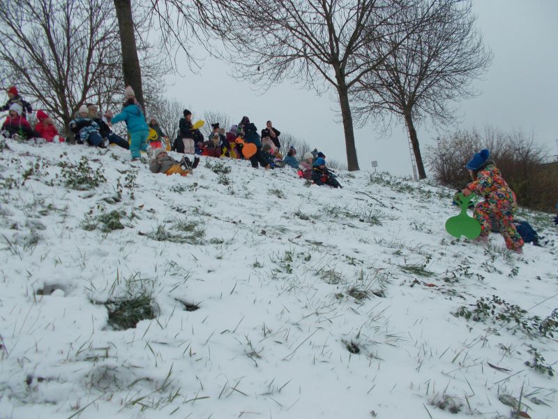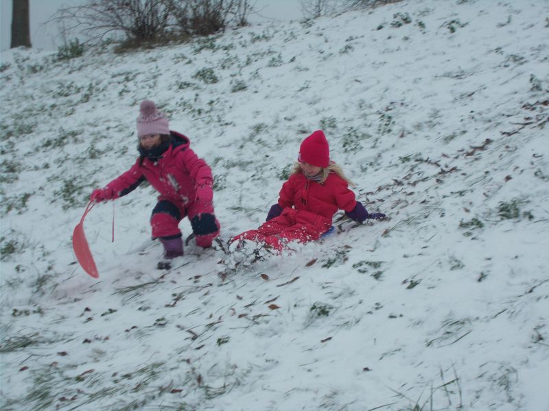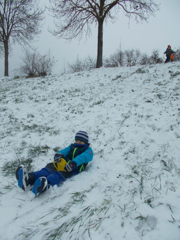 Schnell dicke Schneeanzüge angezogen und los geht's zum Schlittenfahren.